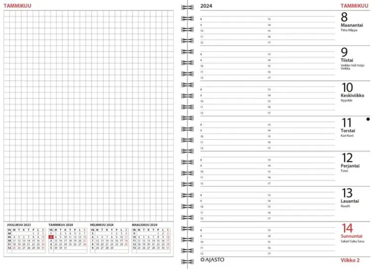 Selkeälinjainen Arjen Kaveri, Joka Kestää Kovaakin Kulutusta. Koko 105 X 148 Mm; Parikierresidottu; Mustat Kolmiosaiset Kannet; Kannen Ikkunasta Helppo Seurata Kuluvaa Viikkoa; Päiväkirja 52/2023–2/2025; Vuosisuunnitelmat 2024 Ja 2025; Suomalaiset Nimipäivät; Irrotettava Puhelinlehti; Runsaasti Muistiinpanotilaa; Fsc®-Sertifioitu Tuote.