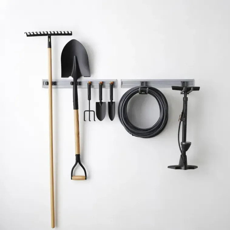 Setti, Jossa On 2 Säilytyskiskoa Työkalujen, Luutien Ja Haravoiden Säilytykseen. Setti Sisältää: 2 Suoraa Työkalukoukkua, 3 Välinekoukkua, 2 Pientä Työkalupidintä, 2 Säilytyskiskoa.