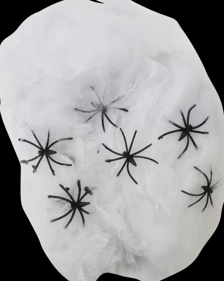 Puuvillasta Valmistettu Hämähäkinverkko Ja Kuusi Muovista Hämähäkkiä. Täydellinen Valinta Halloween-Juhlien Koristeluun.