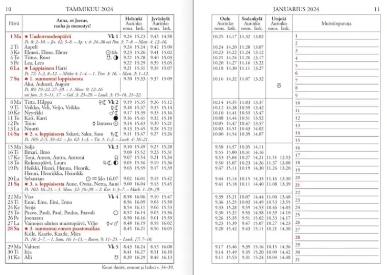 Aito Ja Alkuperäinen. Koko 105 X 148 Mm; Stiftattu; 80 Sivua; Yksi Kuukausi Aukeamalla; Aakkosellinen Nimipäiväluettelo; Auringon Ja Kuun Nousu- Ja Laskuajat Monella Paikkakunnalla; Muita Tähtitieteellisiä Tietoja; Säätaulukoita; Kirkolliset Juhlapäivät Sekä Markkina- Ja Toripäivät; Ajankohtainen Artikkeli; Keltaiset Paperikannet; 100 % Suomalainen; Fsc®-Sertifioitu Tuote.