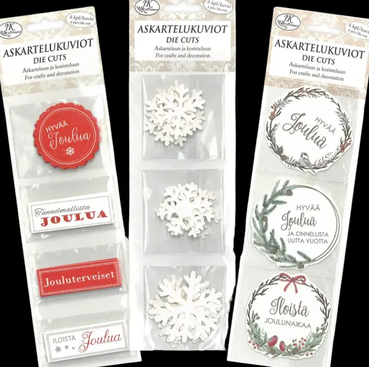 Askartelukuviot Askarteluun Ja Koristeluun. Pakkaus Sisältää Erilaisia Kartonkisia Askartelukuvioita, Joita On 6Kpl Per Kuvio. Kuvioissa On Glitteriä.