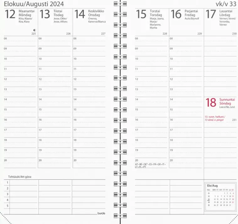 Kalenterin Aukeamalla Yksi Viikko Ja Kuluvan Kuukauden Kalenteritaulukko, Tuntijaotus 08-20. Kalenteri Sisältää Nimipäivät, Kansalliset Pyhäpäivät, Liputuspäivät, Kuun Vaiheet, Vuosisuunnitelmat Kuluvalle Ja Seuraavalle Vuodelle, Vuosiruudukot Kuluvalle Ja Seuraavalle Vuodelle, Yleiset Pyhäpäivät Euroopassa, Kalendaariset Tiedot, Suomen Kartta, Välimatkataulukon Ja Erillisen Puhelinmuistion. Kalenteriosa: Vk 52 2023-Vk 1 2025. Kaksikielinen: Suomi/Ruotsi. Parikierresidottu. Koko 83X158 Mm.