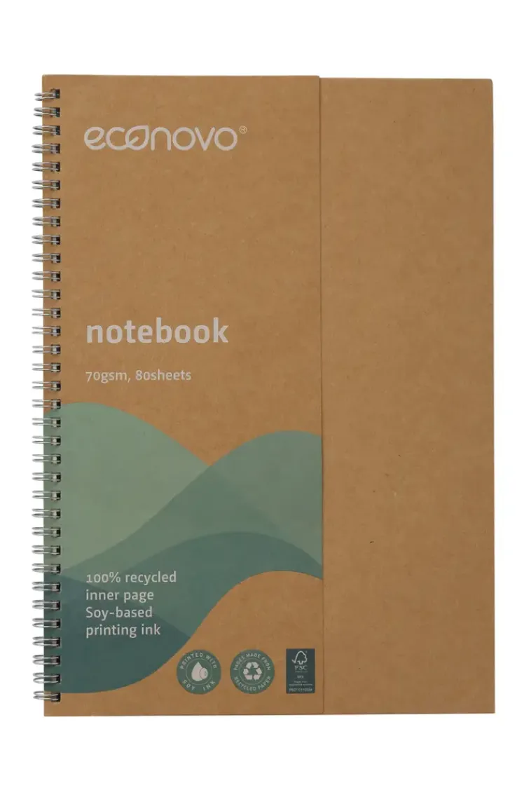Kierrätetystä Paperista Valmistettu Kierremuistikirja. A4-Kokoinen Muistikirja, Jossa 80 Viivoitettua Sivua. Kirjan Mitat: 29,8 X 21,5 X 1,6 Cm.