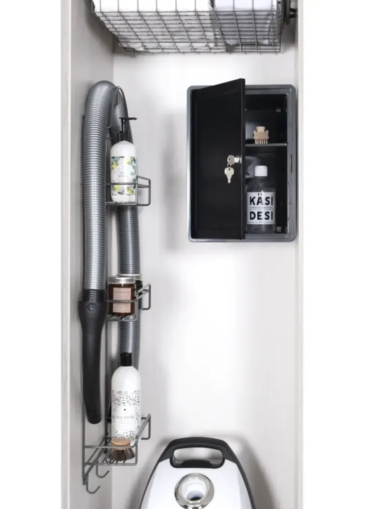 Siivouskomerosarja Lm 871 Sisältää Lukittavan Kemikaalikaapin Ja Siivousvälinetelineen. Lukittava Kaappi Kiinnitetään Ruuveilla Joko Pysty- Tai Vaaka-Asentoon. Siivousvälinetelineessä On Kaksi Hyllyä, Kaari Imuriletkulle Ja Ripustuskoukut. Siivousvälineteline Kiinnitetään Ruuveilla. Valmistettu Suomessa.