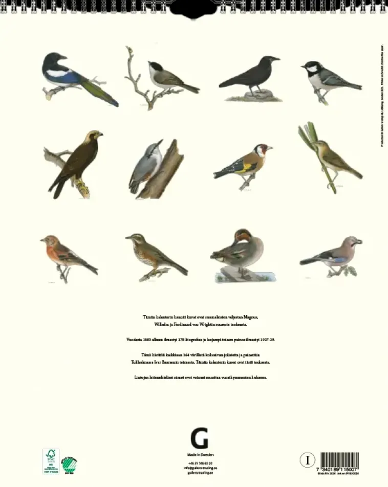 Art Collection-Seinäkalenteri Vuodelle 2024. Erittäin Tukevaa 250 Gramman Luonnonvalkoista Fsc Kartonkia. Suomenkielinen, Suomalaisilla Nimipäivillä. Koko: 328 X 405 Mm. Kalenterilla On Joutsenmerkki. Tämän Kalenterin Kauniit Kuvat Ovat Suomalaisten Veljesten Magnus, Wilhelm Ja Ferdinand Von Wrightin Suuresta Teoksesta. Vuodesta 1883 Alkaen Ilmestyi 178 Litografiaa Ja Laajempi Toinen Painos Ilmestyi 1927-29. Tämä Käsittää Kaikkiaan 364 Värillistä Kokosivun Julistetta Ja Painettiin Tukholmassa Ivar Baarsenin Toimesta. Tämän Kalenterin Kuvat Ovat Tästä Teoksesta. Lintujen Latinankieliset Nimet Ovat Voineet Muuttua Vuosikymmenten Kuluessa.