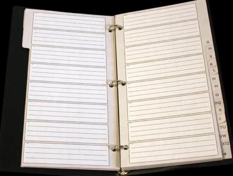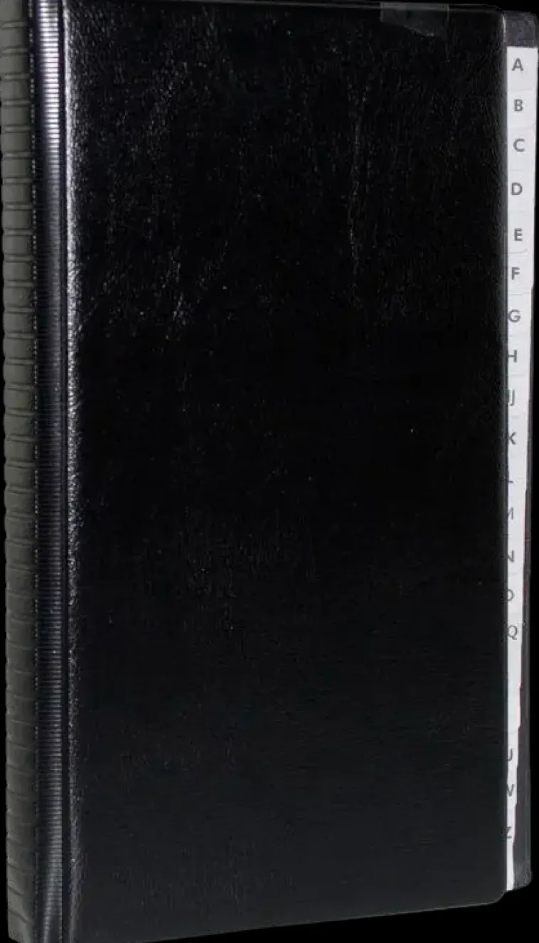 Musta Puhelinmuistio, Jonka Kannet On Nahkajäljiteltyä Muovia. Muistiossa On Kolmirenkainen Mekanismi Ja Hakemistot A/Ö Ja A/Z.