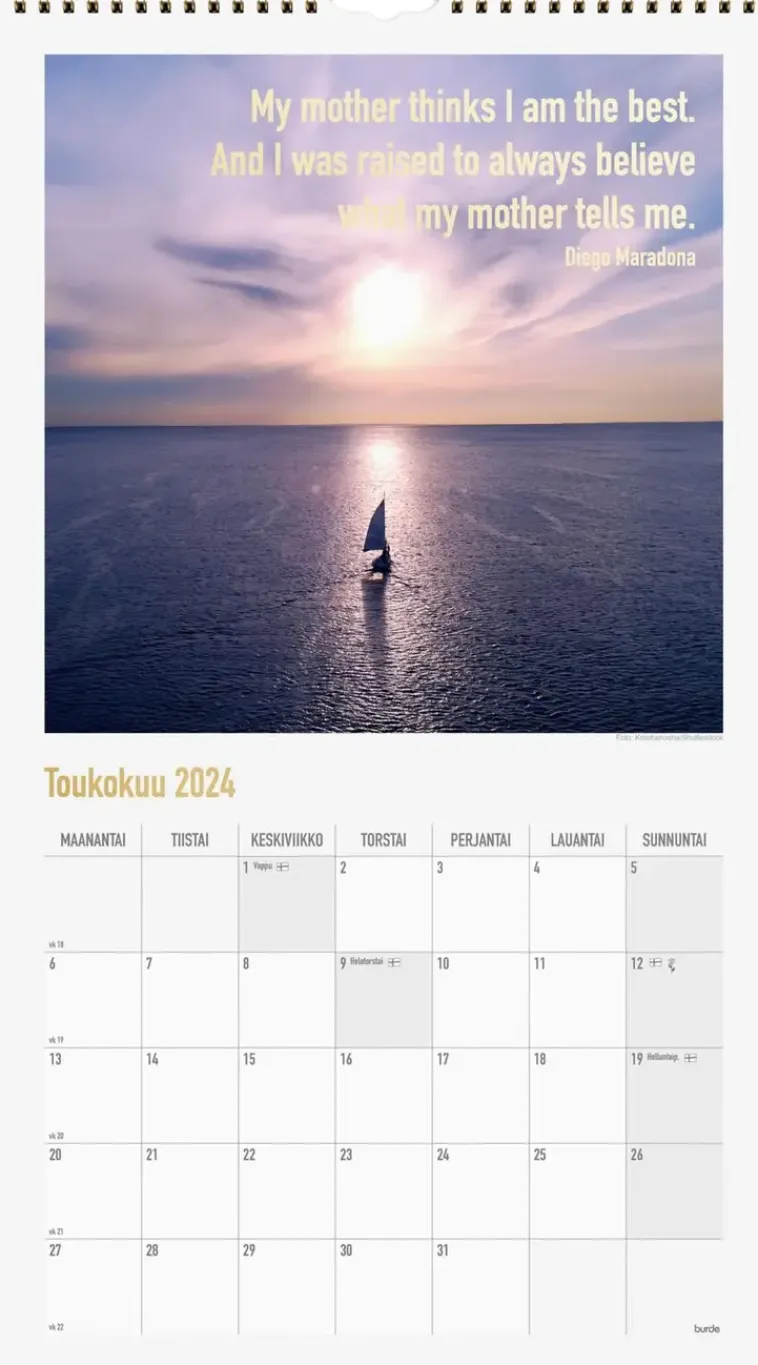 12 Kuvaa. Seinäkalenteri, Jokaisella Aukeamalla Yksi Kuukausi. Kalenteri Sisältää Kauniita Kuvia, Mietelauseita Kultapainatuksella, Juhlapyhät Ja Liputuspäivät. Suomenkielinen. Parikierresidottu. Fsc®.