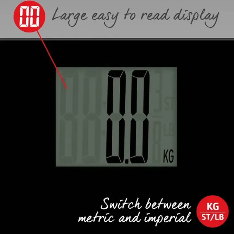 Salter Henkilövaaka On Väritykseltään Musta Ja Muotoilultaan Moderni Kauniin Pyöristettyine Reunoineen. Vaa’Assa On Erityisen Suuri Näyttö, Josta On Helppo Lukea Mittaustulokset. Vaaka Punnitsee Aina 250 Kg Saakka 100 Gramman Tarkkuudella. Salter Myöntää Tuotteelle 15 Vuoden Takuun.