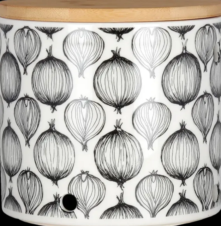 Sipulipurkki Puukannella Kätevään Säilytykseen Keittiössä. Purkissa On Sivuilla Reiät Ja Kansi Bambua. Tuote On Valmistettu Korkealaatuisesta Vitroposliinista.