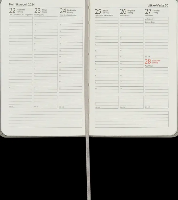 Taskukalenteri Kuminauhalla Ja Kirjanmerkkinauhalla. Koko: A6. Kielisyys: Suomi, Ruotsi. 192 Sivua.