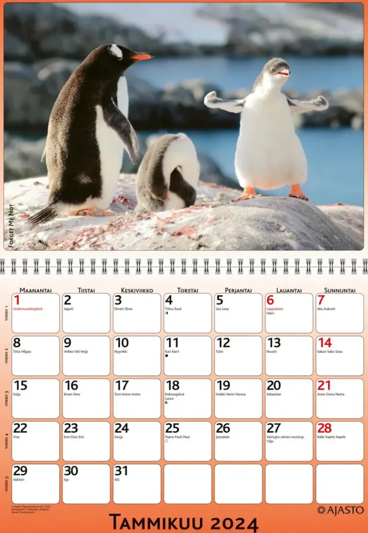 Aina Yhtä Hellyttävä. Koko 290 X 210 Mm, Avattuna 290 X 420 Mm; Parikierresidottu; Kuukausittain Vaihtuva Eläinkuva; Tarra-Arkki Eri Kuva-Aiheilla; Nimi- Ja Juhlapäivät; Avainlippu-Tuote, Fsc®-Sertifioitu Tuote.