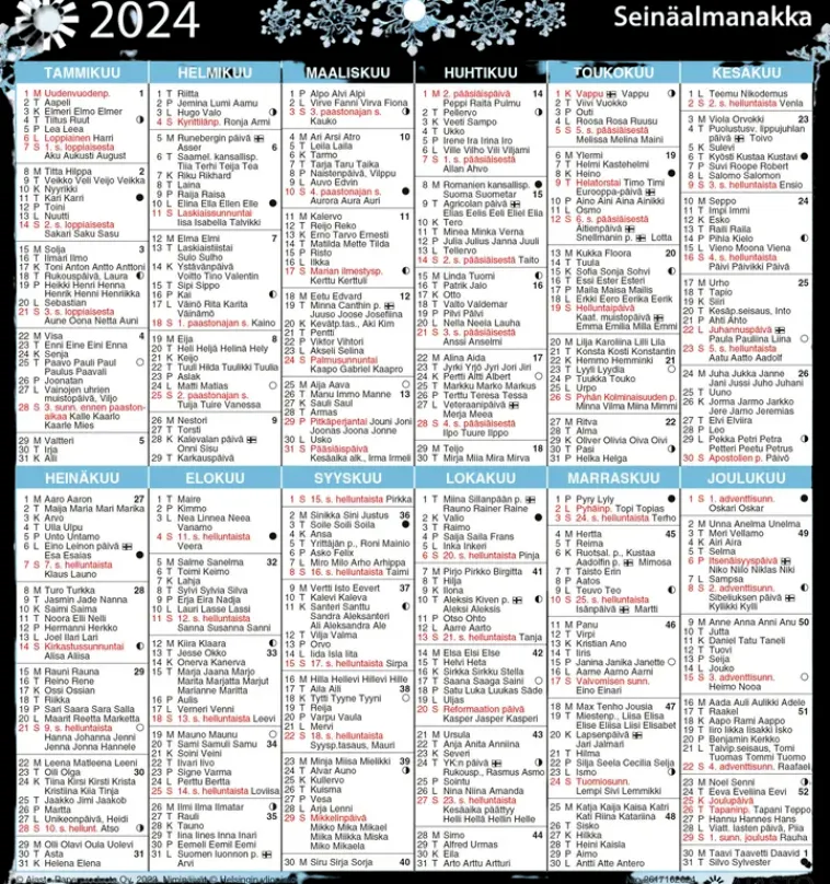 Suosittu Taulukkokalenteri, Kuvio- Ja Värivaihtoehdoilla. Koko 197 X 210 Mm; Kielisyys: Suomi, Ruotsi; Kirkkopyhät; Runsaasti Nimipäiviä; Ripustusreikä; Neljä Eri Vaihtoehtoa: Violetti, Punainen Sekä Kaksi Kuvallista Kalenteria; Fsc®-Sertifioitu Tuote.