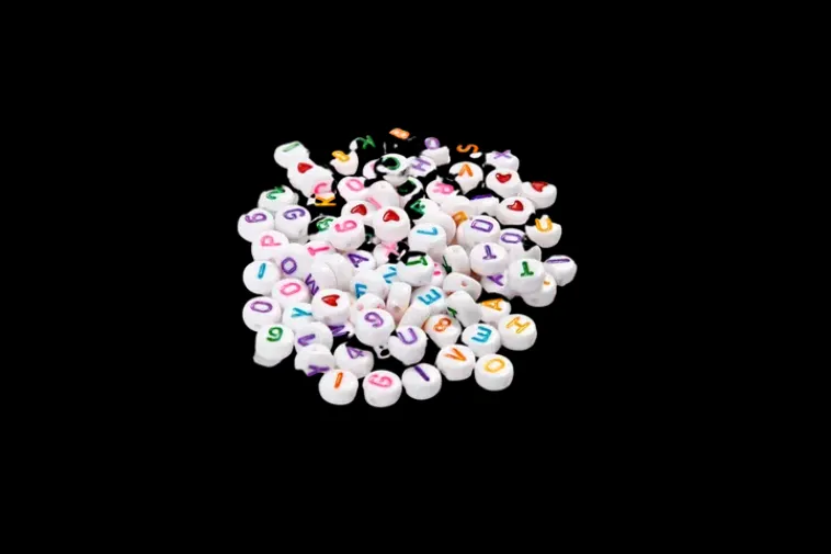 Pyöreät, Tasasivuiset Helmet Valkoista Muovia. Värillinen Kirjain- Tai Numeropainatus Helmen Molemmin Puolin, Joissain Helmissä Painatuksena Punainen Sydän