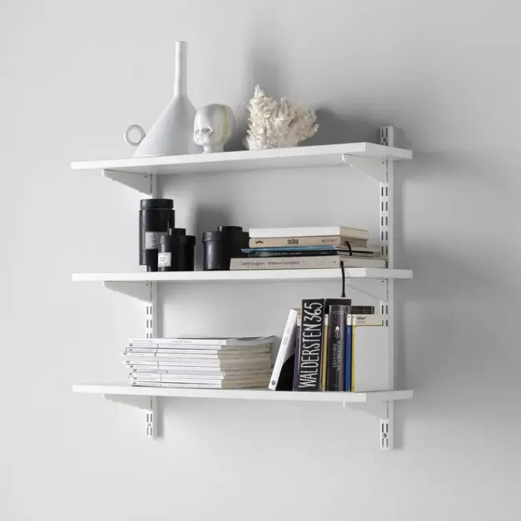 Elfa Säilytyskalusteet-Hyva Valmisratkaisu, Joka Sisaltaa Kaiken Mita Tarvitset Kolmen Hyllyn Kirjahyllyn Luomiseen. Plug-In -Teknologian Ja Seinakiskojen Reikien Ansiosta Helppo Asentaa Oikein Vatupassia Kayttaen.