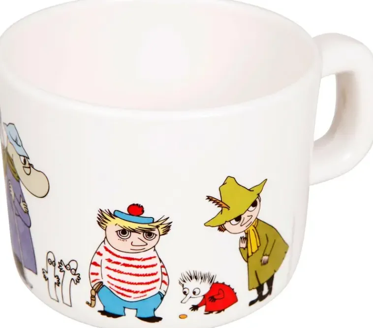 Valkoinen Melamiinimuki, Jossa On Muumihahmojen Kuvia.