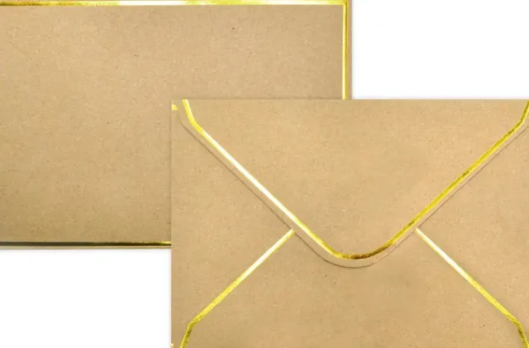 Kirjekuori Askarteluun. Pakkaus Sisältää 10 Kappaletta Ruskeita C6-Kokoisia Kirjekuoria, Joissa Kultainen Foliopainatus. Kirjekuorissa On Kostutettava Liimaläppä. Kirjekuoren Vahvuus 120G/M².