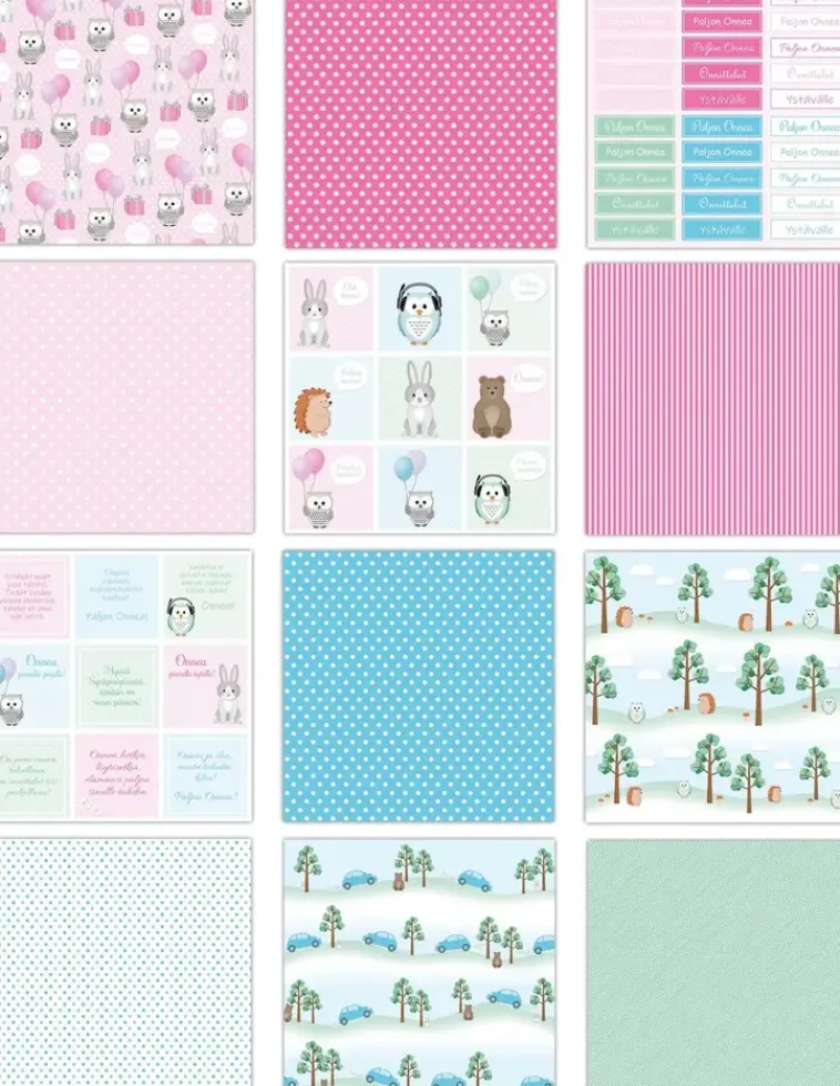 Paperilajitelmassa On Yhteensä 24 Arkkia 12 Eri Kuosilla. Sopii Korttiaskarteluun, Skräppäilyyn Ja Koristeluun. Paperilehtiön Koko Noin 20,5Cm X 20,5Cm.
