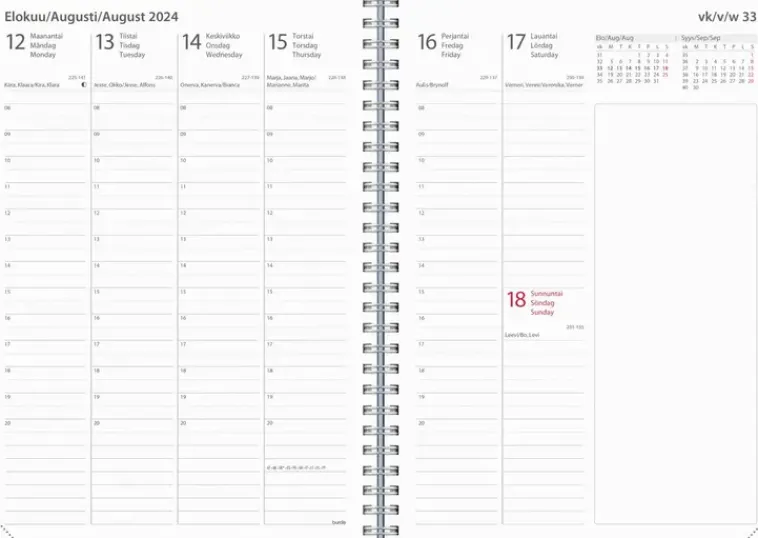 Pellavatekstiilikansi. Kalenterin Aukeamalla Yksi Viikko, Tuntijaotus 08-20, Palsta Muistiinpanoille, Kuluvan Ja Seuraavan Kuukauden Kalenteritaulukot. Kalenteri Sisältää Nimipäivät, Juhlapyhät, Liputuspäivät, Kuun Vaiheet, Vuosisuunnitelmat Kuluvalle Ja Seuraavalle Vuodelle, Vuosiruudukot Edelliselle, Kuluvalle Ja Kahdelle Seuraavalle Vuodelle, Kalendaariset Tiedot, Auringon Nousu- Ja Laskuajat, Yleiset Pyhäpäivät Maailmalla Ja Muistiinpanosivut. Kalenteriosa: Vk 48 2023-Vk 1 2025. Kolmikielinen: Suomi/Ruotsi/Englanti. Parikierresidottu. Koko: 148X210 Mm (A5).