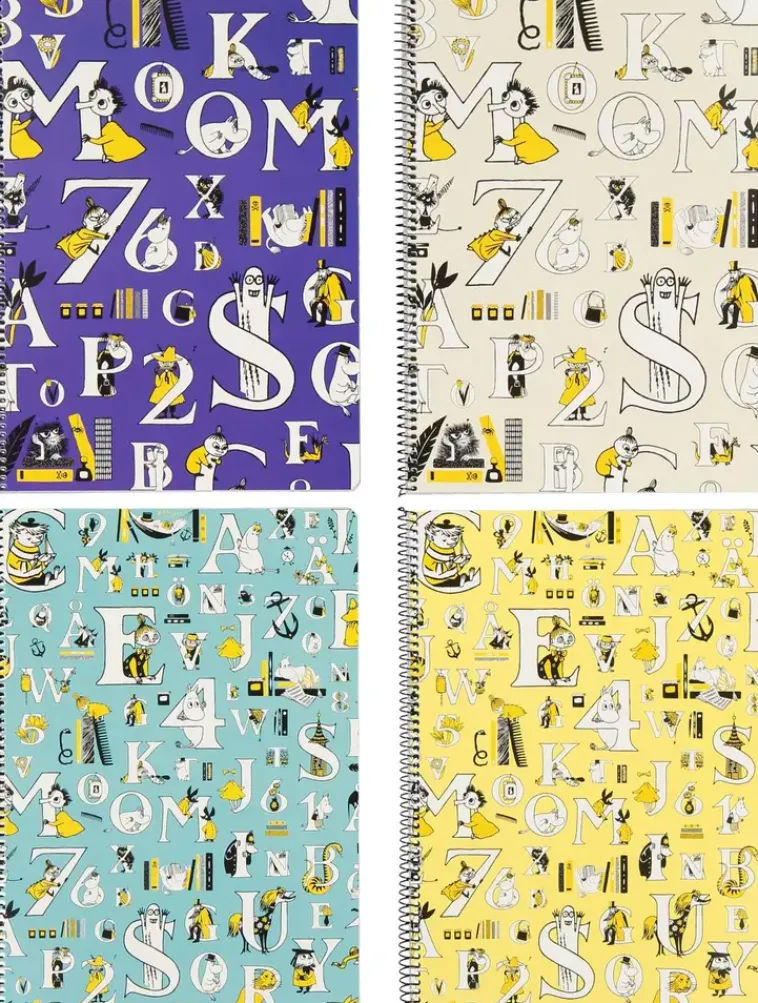 Laadukas Kotimainen Muumi Kierrevihko A4, 80 Sivua 7X7 Mm Ruuduilla. Neljä Raikasta Värivaihtoehtoa Lajitelmana, Uudella Abc-Designilla. Tuotteella On Avainlippu Ja Joutsenmerkk