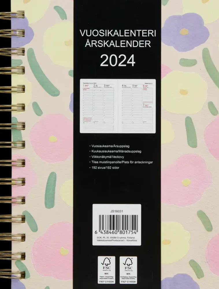 Kierresidottu Vuosikalenteri Kauniilla Kukkakansilla. Koko: A5. Kielisyys: Suomi, Ruotsi. 192 Sivua.