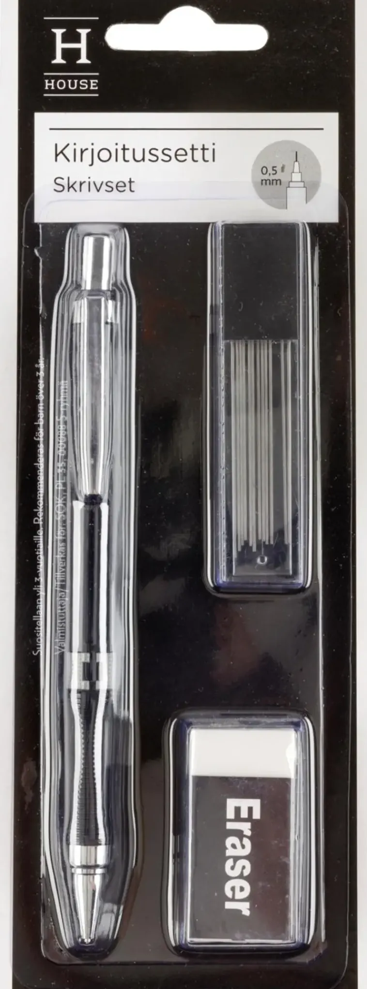 Lyijytäytekynä+Varalyijy+Pyyhekumi.
