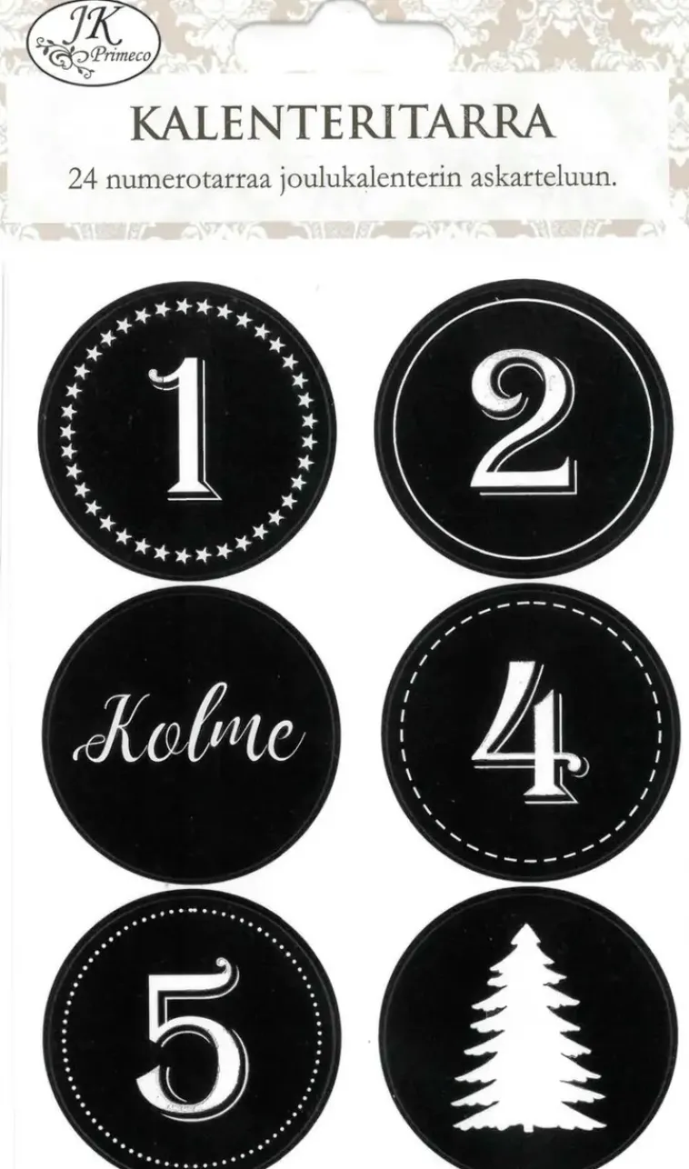Joulukalenteritarra Joulukalenterin Askarteluun. Pakkauksessa Numerotarrat 1-24. 4 Arkkia/Pkt.