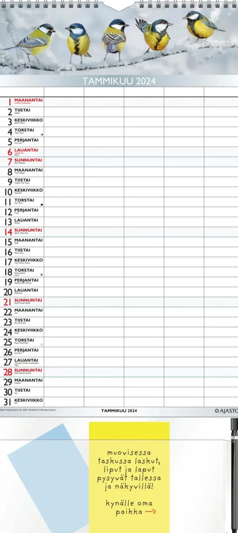 Tiedät Perheesi Menemiset Ja Tulemiset. Koko 250 X 415 Mm; Parikierresidottu; Jokaiselle Päivälle Viisi Saraketta, Joihin Perheenjäsenten Menemiset On Helppo Kirjata; Kätevä Muovitasku Laskuille Ja Kynälle; Nimi- Ja Juhlapäivät; Avainlippu-Tuote; Fsc®-Sertifioitu Tuote.