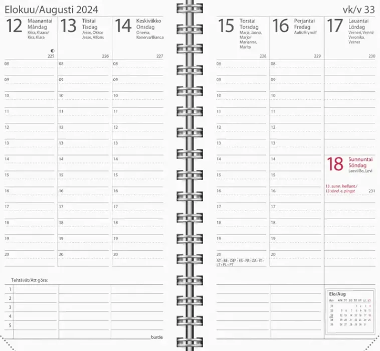Musta Ympäristöystävällinen Uusiokartonkikansi. Kalenterin Aukeamalla Yksi Viikko Ja Kuluvan Kuukauden Kalenteritaulukko, Tuntijaotus 08-20. Kalenteri Sisältää Nimipäivät, Kansalliset Pyhäpäivät, Liputuspäivät, Kuun Vaiheet, Vuosisuunnitelmat Kuluvalle Ja Seuraavalle Vuodelle, Vuosiruudukot Kuluvalle Ja Seuraavalle Vuodelle, Yleiset Pyhäpäivät Euroopassa, Kalendaariset Tiedot, Suomen Kartta Ja Välimatkataulukon. Kalenteriosa: Vk 52 2023-Vk 1 2025. Kaksikielinen: Suomi/Ruotsi. Parikierresidottu. Fsc®. Koko 83X158 Mm.