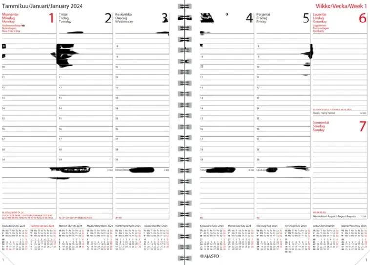 Tehokas Ja Loistelias Kalenteri Päivittäiseen Käyttöön. Koko 148 X 210 Mm (A5); Parikierresidottu; Leatherette-Kannet; Kielisyys: Suomi, Ruotsi, Englanti; 2024 Yleiskalendaario; Päiväkirja 52/2023–1/2025; Vuosisuunnitelmat 2024 Ja 2025; Kansalliset Vapaapäivät; Suomalaiset Ja Suomenruotsalaiset Nimipäivät; Auringon Nousu- Ja Laskuajat (Helsinki, Oulu); Kansainvälinen Aika; Runsaasti Muistiinpanotilaa; Kynä Ja Kynänpidike; Fsc®-Sertifioitu Tuote.
